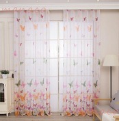 白地にカラフルなバタフライがプリントされている可愛いデザインのカーテンです♪